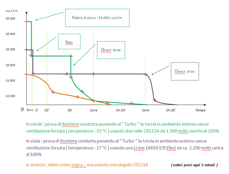 Parlando di " Runtime ANSI " ( 100% --> 10% della potenza iniziale ) possiamo dire che il livello massimo ( Turbo temporizzato ) duri 60 minuti esatti ( da 34.000 a 3.400 cd ).